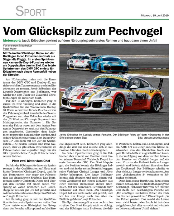 Mit Teamchef Christoph Dupré fuhr Jacob Erlbacher erstmals als Sieger durchs Ziel. Im ersten Sprintrennen kamen die Dupré Porsches wieder als Doppelspitze durchs Ziel. Das letzte Sprintrennen des DMV GTC endete für Erlbacher nach einem Rennunfall neben der Strecke.